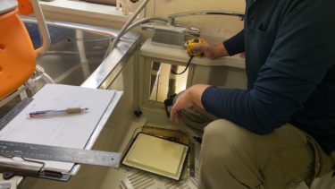 この方は、ユニットを交換する前に発注する浴槽が入るのか確認するために寸法をしてくれています。