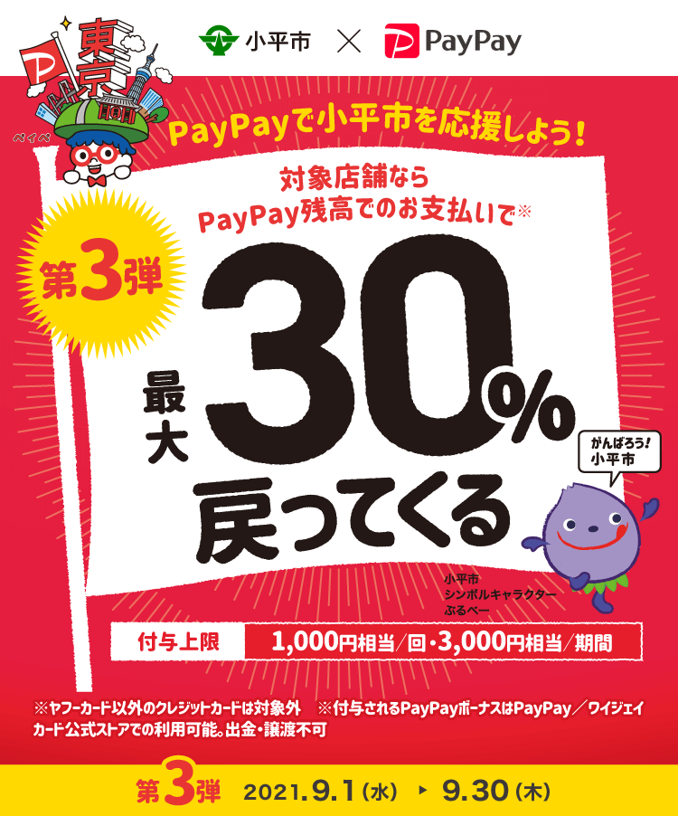 9月1日から小平市×ペイペイにて「対象のお店で最大30%戻ってくるキャンペーンを」を行っています!