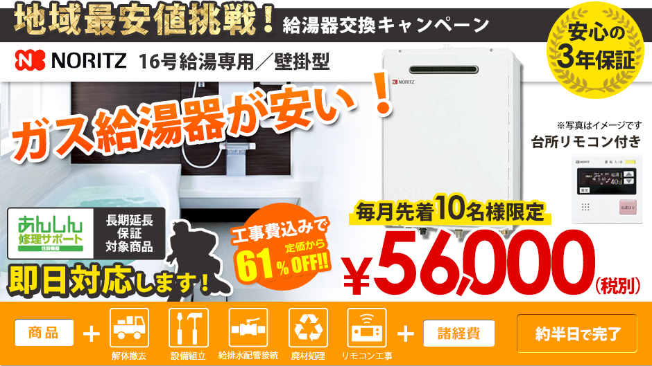 ◇標準工事以外の工事(給水管・給湯管の延長など)やガス工事に関しては別途費用がかかることがございます。お問い合わせの時にご確認ください。