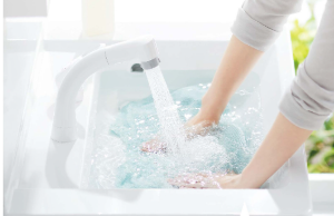 特長的な「すべり台ボウル」や「エコシングル水栓」に加え、収納力のある「奥ひろし」キャビネットや、インテリア性を考慮した扉カラーなど、使いやすさとデザイン性を両立しています。