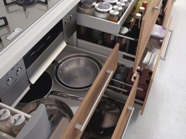 使いやすい引き出し収納。よく使うモノを取り出しやすく、しまいやすく。いつも使うモノにすぐ手が届く。10mm単位ですき間を調整できるフィットサイズ対応だから、ピッタリを実現できます。