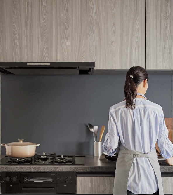 10年間、ファンとフード内部のお手入れ不要。キッチンまわりの油煙の広がりを軽減できます。らくパッと収納