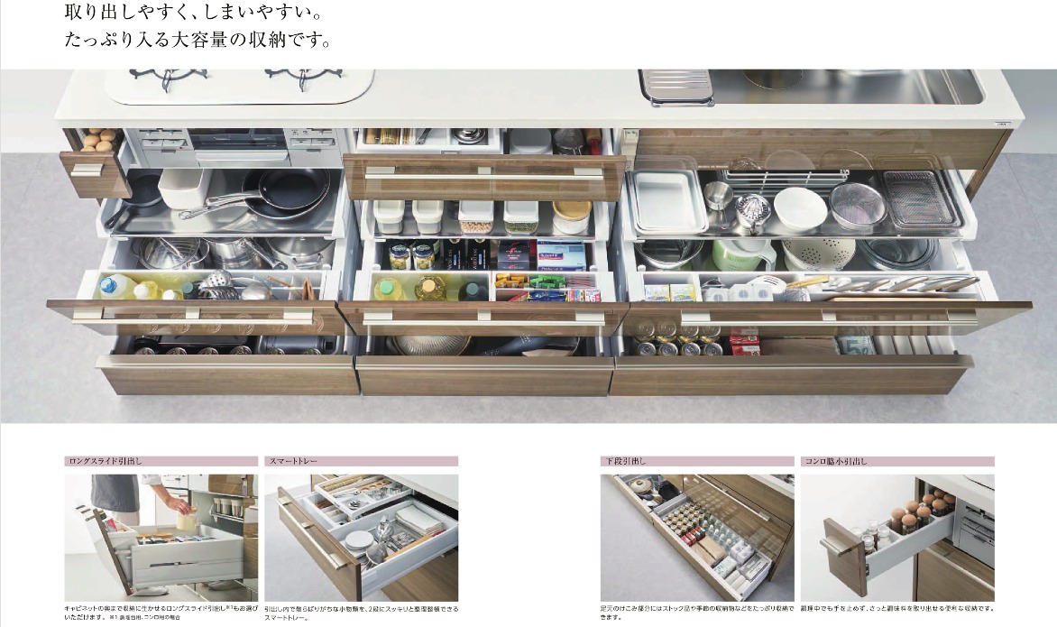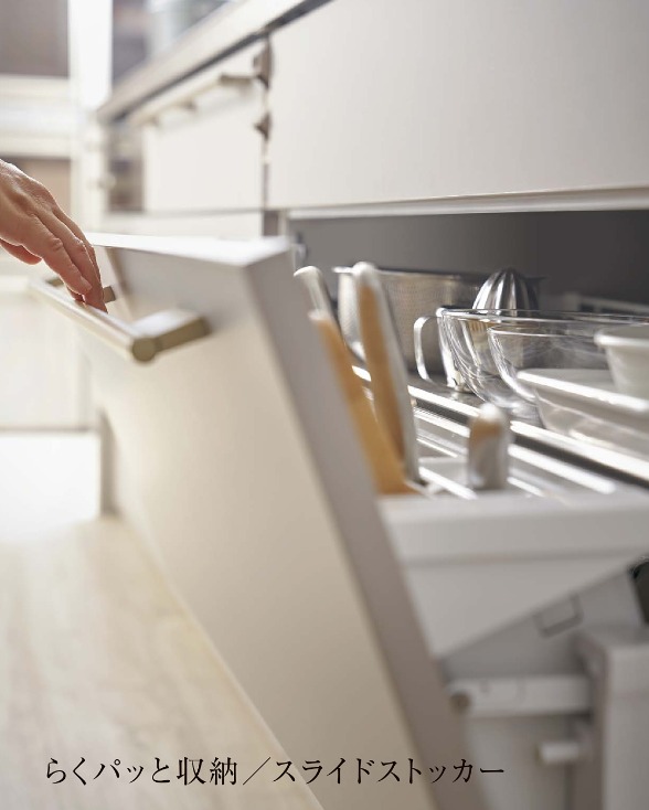 ほしい道具が少ない動きでらくにパッと取り出せます。よく使う物ほど取り出しやすい、立体収納キッチンコンセント
