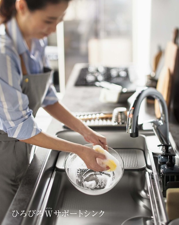 水が広がる”ひろびろシャワー”で、洗い物をスピードアップ。広がる吐水で洗浄効率を高めました。大容量収納
