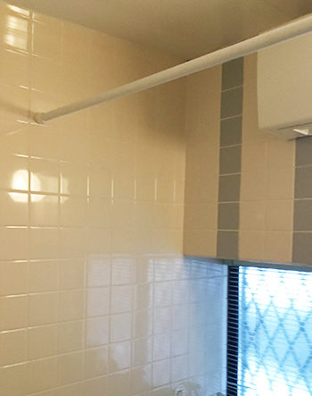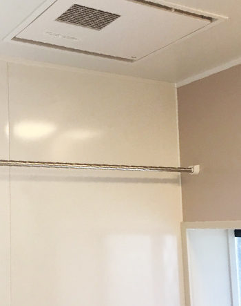浴室の天井近くにはタオル掛けがありますが、スペースを取りすぎているため、空間にゆとりがない印象です。