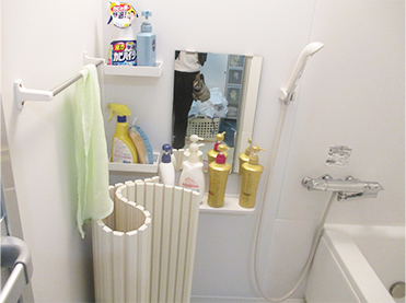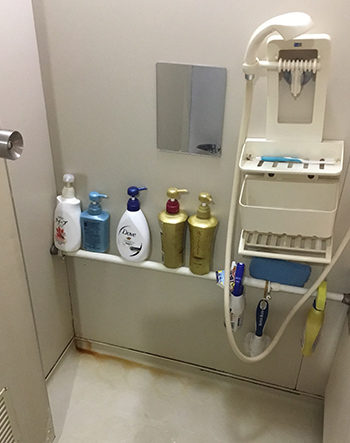 浴室内に物を置くためのスペースがなく、手摺りが棚の代わりになってしまっています。