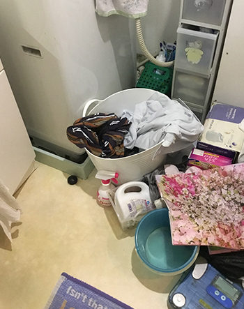 洗面化粧台まわりも、浴室と同じく収納スペースがなく、物が溢れかえっています。